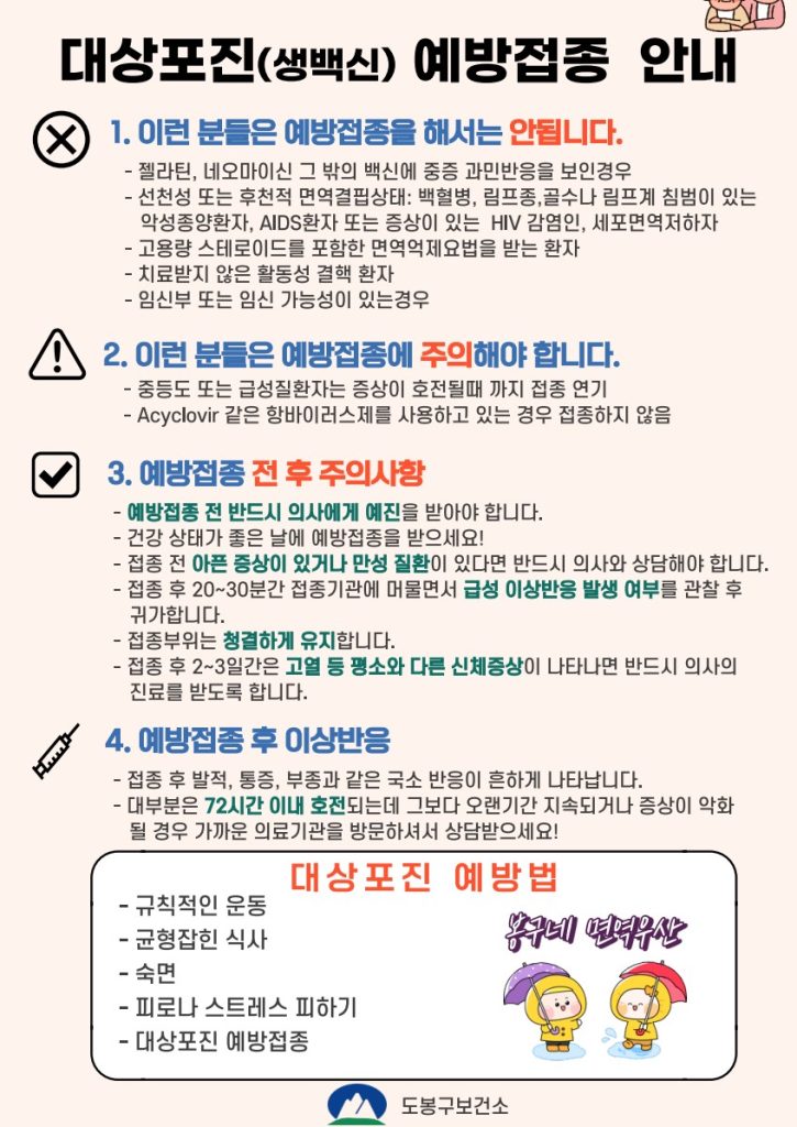- 신청대상 : 도봉구 만 65세 이상 기초생활수급자 중 대상포진 예방접종 이력이 없는 자